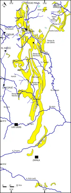 - ↑ a b c d e f g h i j k l Leanza, Héctor A.; Hugo, Carlos (2001). «Hoja Geológica 3969-I, Zapala, provincia del Neuquén». Programa Nacional de Cartas Geológicas de la República Argentina (Servicio Geológico Minero Argentino) (Boletín 275). ISSN 0328-2333.