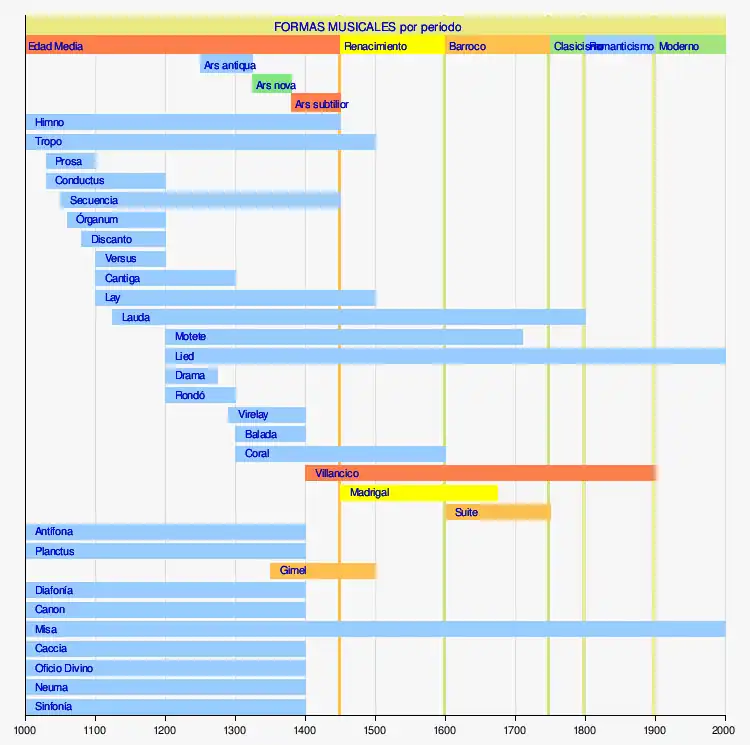 Cronología de formas musicales por periodos y siglos, desde su aparición o primera referencia hasta su desaparición o sustitución.