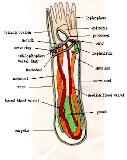 Son dioicos o hermafroditas, según especies, y las gónadas son peritoneales y transitorias. El ciclo de vida es indirecto, y presenta larva actinotroca, que presenta tubo digestivo lineal. La segmentación del huevo es radial y, como el resto de protostomados, el blastoporo da lugar a la boca.