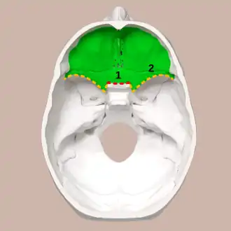 ![]() Vista superior de la base del cráneo. La fosa craneal anterior se muestra en verde. 1: Limbo esfenoidal (margen anterior del surco quiasmático) | ||