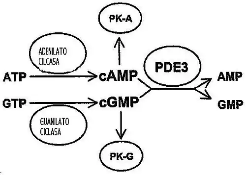 - ↑ a b c d e f Degerman E., Belfrage P., Manganiello V.C. (1997). Structure, localization, and regulation of cGMP-inhibited phosphodiesterase (PDE3) (en inglés). Journal of Biological Chemistry, 272(11): 6823-6826.