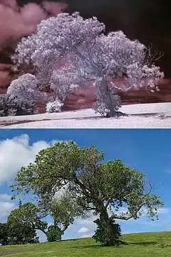 En la fotografía de infrarrojos, la película o el sensor de imagen utilizado es sensible a la luz infrarroja. La parte del espectro utilizada se denomina infrarrojo cercano para distinguirla del infrarrojo lejano, que es el dominio de la imagen térmica. Las longitudes de onda utilizadas para la fotografía van desde unos 700 nm a unos 900 nm. La película suele ser también sensible a la luz visible, por lo que se utiliza un filtro pasante de infrarrojos; este permite que la luz infrarroja (IR) pase a través de la cámara, pero bloquea todo o la mayor parte del espectro de luz visible (el filtro se ve así negro o rojo intenso). (El término "filtro de infrarrojos" puede referirse a este tipo de filtro o a uno que bloquea los infrarrojos pero que pasa por otras longitudes de onda).