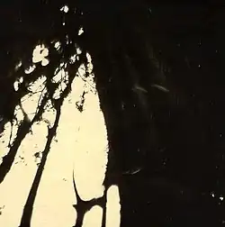 La "masa de negro" que rodea la vista de los cadáveres y las fogatas, esta masa donde "nada es visible" da en realidad una "marca visual" que es tan valorable como el resto de la superficie expuesta. Esa masa donde nada es visible es el espacio de la cámara de gas: el "cuarto oscuro" en el que uno tenía que retirarse, retroceder, en orden a dar luz a el trabajo del Sonderkommando afuera, sobre las fogatas. Esa masa de negro nos da la situación en si, el espacio de posibilidades, la condición de la existencia de las mismas fotografías.[29]