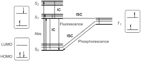 Este estado triplete puede relajarse al estado fundamental S0 por CI sin radiación o por una vía de radiación llamada fosforescencia. Este proceso implica un cambio de espín electrónico, que está prohibido por las reglas de selección de espín, lo que hace que la fosforescencia (de T1 a S0) sea mucho más lenta que la fluorescencia (de S1 a S0). Así, los estados tripletes suelen tener tiempos de vida más largos que los estados singletes. Estas transiciones suelen resumirse en un diagrama de energía de estado o diagrama de Jablonski, paradigma de la fotoquímica molecular.