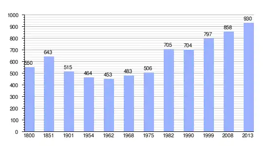Los datos demográficos contemplados en este gráfico de la comuna de Fréville[4] se han cogido de 1800 a 1999 de la página francesa EHESS/Cassini, y los demás datos de la página del INSEE.[5]