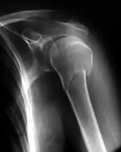 La tuberosidad mayor del húmero o troquíter da inserción al músculo supraespinoso, músculo infraespinoso y músculo redondo menor.[4] Es un segmento óseo que puede fracturarse cuando se produce por un golpe violento y directo a la cabeza humeral, en una caída de lado contra el suelo, conllevando a seis variantes de acuerdo a la clasificación de Neer:[3]