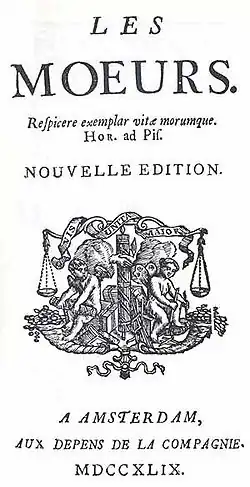 - Les Mœurs, s.l., s.e., 1748.(Las costumbres) Tercera edición / 1748[1][2]