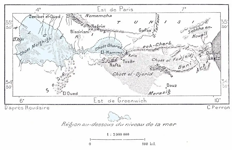 Obteniendo resultados muy por debajo del nivel del mar (hasta - 40 m), y sin conocer la parte tunecina, Roudaire quedó convencido de que la vasta depresión geográfica salada que se extendía hasta el golfo de Gabes era el lecho de un antiguo mar desecado conocido en la época de Heródoto como la bahía de Triton. En un artículo escrito el 15 de mayo de 1874 para la Revue des Deux Mondes, «Une mer intérieure en Algérie», el oficial consolidó su hipótesis y propuso recuperar ese mar mediante la excavación de un canal excavado desde el umbral de Gabes. Entre otros beneficios, la masa de agua introducida alteraría materialmente el clima local y ayudaría a convertir la región en un «granero de trigo». Ferdinand de Lesseps, que acababa de triunfar en el canal de Suez, adoptó la idea. Y con él muchos escritores, científicos y políticos.
