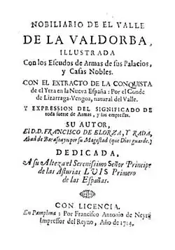 En 1714 recibe el encargo de Francisco de Elorza Rada, abad de Barásoain, de imprimir el tratado que este ha preparado titulado Nobiliario de la Valdorba,[30] del que hará una tirada de 600 ejemplares. La obra ofrece la particularidad de contar con un centenar de grabados, abiertos en exclusiva para esta edición, con los escudos de las casas blasonadas de ese valle navarro.