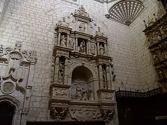 El grueso decorativo de esta capilla es obra de Francisco Giralte, discípulo aventajado de Alonso de Berruguete, que no habría podido encargarse de este proyecto personalmente. La primera pieza que conforma este conjunto escultórico es la puerta de entrada a la propia capilla. Realizada en madera de nogal, su decoración plateresca combina escenas sacras en casetones con figuras profanas, así como grutescos y decoración a candelieri, motivos característicos de esta etapa. Esta puerta es ya en sí misma, prueba evidente de la destreza escultórica de Giralte.