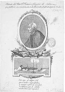 - ↑ Su necrológica -Elogio de Don Francisco Gregorio de Salas— apareció en Minerva o el Revisor General de 3 de enero de 1808, pp. 153-155: «Murió —concluía— de una inflamación en la pierna, que le provino de haber descuidado un golpe que se dio en ella, en tales términos que aun salió a buscar noticias, á las que era muy aficionado, tres días antes del último de su vida. —No quiso valerse de ningún facultativo. Murió el 3 de este mes de diciembre á los setenta y ocho años, diez meses, y cinco días de su edad, y se le enterró en la iglesia de las Recogidas, de donde era capellán».