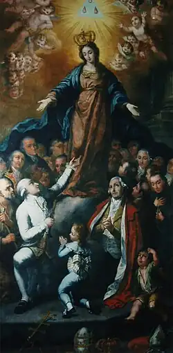 La Virgen está representada al estilo de las de la Misericordia de tipo medieval pero con rasgos barrocos. El valor iconográfico de esta obra está en que a los pies de la Virgen aparecen retratados algunos de los miembros de la élite gaditana de la época, como Teodomiro Díaz de la Vega, prepósito de la congregación de San Felipe Neri; el conde de Villamar y su hijo Miguel Beyens y Beyens, que en 1830 sería canónigo lector de la Catedral de Cádiz. Las obras de este pintor alemán se crearon en su mayor parte para la exportación a las colonias americanas.