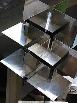 Desde el punto de vista conceptual, las esculturas de acero pulido de Sobrino también deben verse como espejos. El objeto espejo, si se tiene en cuenta únicamente su materialidad, no es más que una pieza de metal que, sin embargo, contiene potencialmente todo el mundo visible. . […] A la vez simples, prolíficos y esquivos cuando se los observa, estos tótems de la inestabilidad moderna confrontan al espectador en movimiento con un objeto y un fenómeno, devolviendo la plenitud a cada experiencia perceptiva.