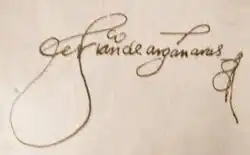 "Hallé en ésta falta de gente principal. Traje conmigo siete u ocho caballeros conocidos como son don Pablo de Guzmán, hijo de Luis de Guzmán gobernador que fue de Popayán, con su mujer e hijos e a don Fernando de Toledo Pimentel sobrino de don Francisco de Toledo y a don Iñigo Ramírez mi sobrino e a don Francisco de Argañaraz e a tres hijos míos con otros hidalgos muy honrados..."