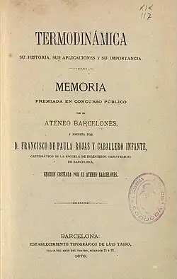 - Termodinámica: su historia, sus aplicaciones y su importancia. Estab tip. Luis Tasso. Barcelona, 1876.