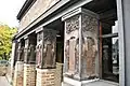 La mayoría de las esculturas en el exterior de la casa y el estudio fueron diseñadas por el amigo y colaborador de Wright, Richard Bock. Estas incluyen las dos figuras de roca que flanquean la entrada del estudio, que presenta a un hombre agazapado y liberándose del suelo debajo de él. Bock también diseñó los capiteles de la cigüeña en la logia exterior del estudio. Los capiteles representan el árbol de la vida, el libro del conocimiento, un rollo arquitectónico y dos cigüeñas llenas de sabiduría y fertilidad.