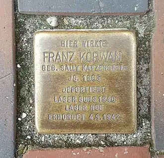 - Hay una piedra conmemorativa ( Stolperstein ) para Franz Korwan en Strandstraße 12 en Westerland, frente a su primer estudio. Otros están en Keitum y Baden-Baden.
