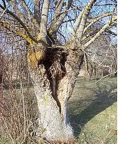 ![]() Fresno originalmente desmochado. Al no mantenerse las podas, el árbol adquiere este aspecto característico (Colmenar Viejo, España). | ||