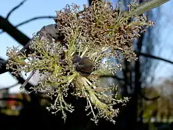 Flores unisexuales, dispuestas en panículos terminales y compactos; las flores masculinas poseen un cáliz campanulado ligeramente lobulado; las flores femeninas tienen un estilo largo, derecho, purpúreo, y están desprovistas de pétalos.