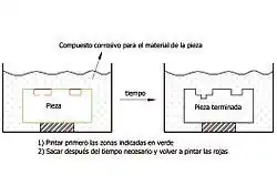 Para atacar acero con este proceso se utilizan los ácidos, como el clorhídrico (HCl) o el nítrico (HNO3), mientras que para aleaciones ligeras se emplean las bases, como puede ser la sosa (NaOH) o la potasa (KOH). En el caso del titanio se trata de sumergir la pieza en una mezcla de ácido nítrico-fluorhídrico en presencia de un tensoactivo a unos 400°C de temperatura. El aislante usado para las zonas que no se deseen atacar es un compuesto de base de neopreno o copolímero de isobutileno-isopropileno. Se suele enmascarar toda la pieza para después proceder a la eliminación del aislante de las zonas a atacar mediante procesos de corte convencional, o más modernamente con tecnologías láser.