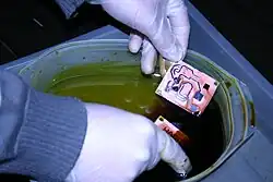 En esta modificación del fresado químico el material se elimina de piezas planas y delgadas mediante técnicas fotográficas. De esta manera se pueden troquelar de manera sencilla y sin rebabas geometrías complicadas, con bajo costo, puesto que el proceso es automatizable para aplicación en medias o grandes series de producción. Uno de los inconvenientes de este proceso es la eliminación de los residuos generados.