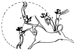 ![]() Fresco del salto del toro, que muestra a un acróbata sobre un toro con dos mujeres acróbatas a los lados | ||