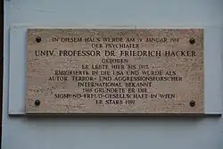 Friedrich Hacker, conocido en EE. UU. como Frederick J. Hacker (Viena, 19 de enero de 1914 - Maguncia, 23 de junio de 1989, fue un psiquiatra y psicoanalista austríaco, nacionalizado estadounidense, experto en temas relacionados con la agresividad de los seres humanos y las motivaciones psicológicas del terrorismo. Es conocido además por haber participado como forense o asesor psiquiátrico de los tribunales en varios juicios por asesinatos de figuras destacadas de Hollywood, como el de la actriz Sharon Tate, cuyo resultado fue la condena de Charles Manson y varios de sus seguidores.[1]