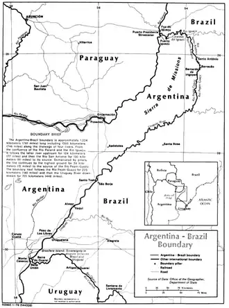 Los límites de Brasil con Argentina se encuentran definidos por el Tratado de 1898 (que se basa en el Laudo Arbitral de 1895), expedido por el presidente de los Estados Unidos Grover Cleveland, y está perfectamente marcada. El trabajo de demarcación están a cargo de la llamada "Comisión Conjunta de Inspección de Hitos de la Frontera Brasil-Argentina" (creada en 1970), que ha desplegado 310 hitos fronterizos.[2]