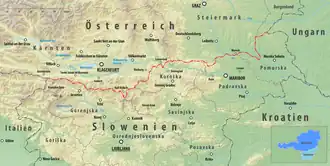 | Trazado de la frontera austriaco-eslovena (en rojo). | ||||