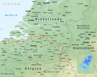 Comienza en el sur del trifinio del Vaalserberg que reúne las fronteras germano-belga y germano-neerlandesa, y luego termina en el este, en el mar del Norte en Zwin. Un total de 369 postes fronterizos en hierro fundido delimitan la frontera. Son puestos esencialmente en los lugares donde la frontera cambia de dirección. Históricamente después de un puesto fronterizo debería poder verse el puesto siguiente. Actualmente esto no es así.