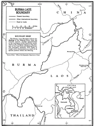Esta frontera fue definida en 1948 con la independencia de Birmania, que había sido una colonia británica separada de la India en 1937. En 1949 Laos obtuvo una independencia provisional del dominio francés, confirmada después en 1954. Desde finales del siglo XIX Laos formaba parte de la Indochina francesa.[2]
