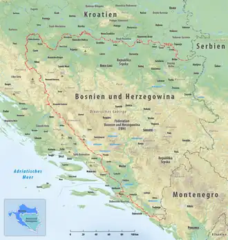 El trazado empieza en el trifinio entre ambos estados y Serbia sobre el río Sava cerca de Vršani. Sigue el curso del río hasta Jasenovac, desde donde continúa por el río Una hasta Novi Grad; entonces abandona el curso del río para retomarlo cerca de Bihać. Desde la ciudad de Martin Brod continúa por un camino de cerros poco poblado, casi paralelamente al mar, hasta acercarse al mar Adriático entre Klek y Neum. Después de 20 km de costa, retoma el recorrido hasta el trifinio con Montenegro.[2]