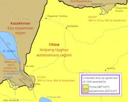 ![]() Localización de Kazajistán (naranja) y China (verde).