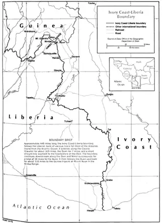 - Cote D'Ivoire (Ivory Coast) – Liberia Boundary (pdf). International Boundary Study, n. 132 (en inglés). The Geographer - USA State Department. 2 de enero de 1973. p. 7.