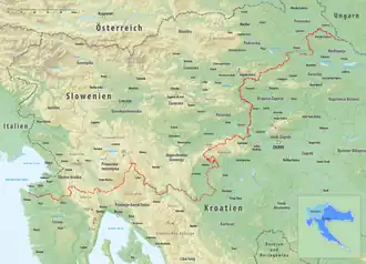 Empieza al este, junto al puerto esloveno de Koper (Capodistria) en el mar Adriático, a la bahía de Piran y muy próximo a la frontera con Italia, donde desemboca el río Mura. Sigue hacia el oeste por el río Drava hasta las proximidades del meridiano 15 este, donde empieza a seguir la dirección nordeste hasta el trifinio con Hungría. Separa los siete condados croatas norteños, incluido el condado de Zagreb, de las regiones eslovenas de Obala in Kras, Dolenjska in Bala krajina, Savinjska, Pohorge z okoliko y Prekmurje.