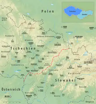 Empieza en el trifinio entre Chequia, Eslovaquia y Polonia, y las ciudades más próximas en la frontera son Mosty (Chequia), Jaworzynka (Polonia) y Świerczynowiec (Eslovaquia). Acaba en el trifinio entre Chequia, Eslovaquia y Austria, cerca de las ciudades de Zlín, Vsetín, Hódonin (Chequia) y Žilina y Trenčín (Eslovaquia). Separa las regiones checas de Moravia Meridional, Zlín y Moravia Silesia de las regiones eslovacas de Trnava, Žilina y Trenčín.