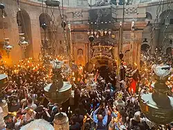 En 1834, en presencia del gobernador Ibrahim Pasha, los frenéticos peregrinos en la iglesia abarrotada y llena de humo crearon una estampida, agravada por los guardias, que se abrieron paso entre las masas. Supuestamente, 400 personas perdieron la vida, según las palabras del viajero inglés de Oriente Próximo, Robert Curzon.[7]