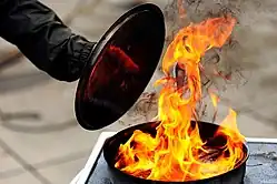 Los fuegos se clasifican según el agente extintor adecuado. Si bien se usa agua en fuegos de Clase A, usar agua en fuegos de Clase B (como un fuego de grasa) es extremadamente peligroso.[3][5] Esto se debe a que la grasa quemada está más caliente que el punto de ebullición del agua (100 grados Celsius); cuando se coloca agua sobre la grasa, se genera vapor que se expande rápidamente y salpica, provocando quemaduras y propagando el fuego.[3] Debido a esto, los extintores de fuegos clase A utilizan agua, mientras que los extintores de fuegos clase B utilizan productos químicos secos (espuma o polvo),[5] como espuma formadora de película acuosa, productos químicos secos multiusos como fosfato de amonio y agentes halogenados (tales como Halón 1301 y Halón 1211)[6] o dióxido de carbono altamente presurizado.[5] Algunos extintores contienen sustancias químicas diseñadas para combatir fuegos de Clase A y Clase B.[6]