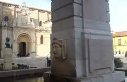 La fuente de San Isidoro fue construida en 1787[1] durante el reinado de Carlos III como aparece en una de las inscripciones de la fuente. Inicialmente ocupó el centro de la plaza. La fuente está constituida por un gran pilar almohadillado en el que aparece en su parte superior un león que sostiene una columna y un escudo con estandartes militares romanos recordando la fundación romana de la ciudad.[2] Dos máscaras dejan caer los chorros de agua. Una de ellas representa a Medusa, y la otra una máscara de teatro. La obra de fontanería es obra de Isidro Cruela, como las del resto de fuentes de la época en la ciudad. En 1965 la fuente se trasladó desde el centro de la plaza a uno de sus laterales donde permanece desde entonces. La fuente fue restaurada en 2010.