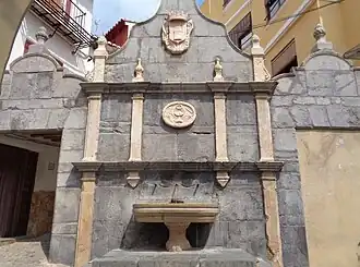 Se trata de una fuente en forma de monumental retablo, datada en 1770, y realizada siguiendo el estilo barroco. Presenta tres cuerpos rematados con frontones mixtilíneos. Los dos cuerpos laterales corresponden a sendas puertas, de las cuales la derecha (vista la fuente de frente) está cegada, utilizándose la izquierda como vía de acceso al tramo de la calle que se extiende por detrás del monumento hidráulico.[2]