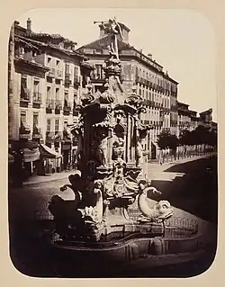 Alfonso Begué fotografió en 1864 la errante fuente de la Fama, instalada en 1732 en Antón Martín. Según Cayetano,[6] tras trasladarse en principio al barrio de Las Peñuelas,[7][b][1] en 1880, fue desmontada y ‘guardada’. En 1911, recurriendo a materiales de otros monumentos se colocó en el parque del Oeste, hasta que en 1941 se trasladó a los jardines del Arquitecto Ribera, junto al Museo Municipal de Madrid.