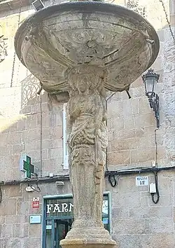 Realizada en piedra y situada en la plaza del Hierro, conocida en el pasado como «Cruz dos Ferreiros» («Cruz de los Herreros») y punto donde confluyen cinco calles, [nota 5] lo que hace que tenga un perímetro triangular, la fuente se asienta en el centro de un gran pilón lobulado de planta hexagonal. Del eje central parte un pilar compuesto por un total de tres cuerpos y rematado todo por un coronamiento. Descrita por Florentino Cuevillas como «muy del quinientos, resalta por su elegancia renacentista y con mucha y oscura mitología», sobre una base con forma de hexágono macizo se yergue el primero de los cuerpos, formado por cuatro relieves femeninos semejantes a nereidas (ninfas de los mares), por lo general representadas cabalgando sobre delfines o caballos marinos, si bien en este caso tan solo figura la mitad superior de las mismas surgiendo del agua y enlazadas unas con otras mediante coronas de follaje que sujetan bajo los brazos.[6]: 288