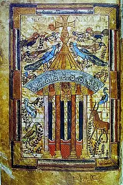 Los mejores ejemplos datan de la época carolingia: el Evangeliario de Godescalco realizado para conmemorar el bautismo del hijo de Carlomagno en 781, y en los Evangeliario de Soissons.