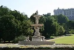 El trazado, tanto del edificio como del conjunto ajardinado y sus diferentes elementos ornamentales, fue encargado por el infante a Ventura Rodríguez, quien finalizó las obras en el año 1765. A este arquitecto se debe el diseño de la fuente, mientras que su realización corresponde a los escultores Felipe de Castro y Manuel Álvarez el Griego, siendo finalizada por este último en 1776.[1]
