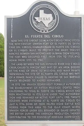 - ↑ «El Fuerte del Cibolo Historical Marker». www.hmdb.org (en inglés). Consultado el 11 de agosto de 2024.