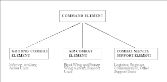 - El Elemento de Mando (en inglés Command Element, CE), una unidad de cuartel general que dirige a los otros elementos.