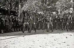 A finales de 1938 las fuerzas del Ejército nacional ya sumaban más de un millón de efectivos, entre los que se encontraban alistados la mayor parte los hombres útiles comprendidos entre los 18 y 31 años, además de numerosos voluntarios.[29] El Ejército de Tierra se encontraba dividido 4 grandes agrupaciones de tropas: el Ejército del Sur, inactivo en Andalucía y a las órdenes de Queipo de Llano; el Ejército del Centro, a las órdenes de Saliquet; el Ejército del Norte, al mando de Dávila; Y el Ejército de Levante, revelación de la guerra, al mando del General Orgaz.[30] En aquel momento se componía de 61 divisiones de infantería (840.000 hombres), 15.323 hombres de caballería, 19.013 de artillería, 35.000 efectivos del Ejército de África, 32.000 italianos del Corpo Truppe Volontarie, 5.000 alemanes de la Legión Cóndor y otros 119.594 procedentes de servicios auxiliares.[31] En total, 1.065.941 efectivos.[31] A estas alturas de la guerra los republicanos se hallaban agotados, prácticamente sin reservas: En diciembre comenzó la Ofensiva de Cataluña, la cual finalizaría en febrero de 1939 con la conquista de la región y un gran éxito militar para las Armas de Franco.[32] El 26 de marzo comenzó la ofensiva final de la guerra civil, con el avance sin oposición de los ejércitos franquistas sobre la desmoralizada retaguardia de la España republicana.[33] Al anochecer del 31 de marzo se rindió el puerto de Alicante, la última posición sin conquistar, y con ella finalizó oficialmente la guerra civil.[34]