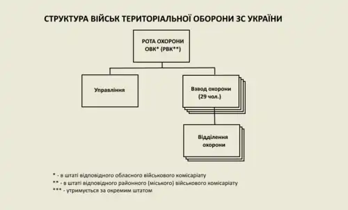 Cada comisaría militar forma una compañía de seguridad y las comisarías militares regionales, además, son responsables de los batallones de defensa territorial (BtrO, 27 batallones). Cada comisaría militar de distrito (ciudad) en su área de responsabilidad es responsable de formar de dos a cinco destacamentos del tamaño de una compañía, dependiendo de las tareas asignadas (ZgO, 490 + 111 (distritos en ciudades), 1202 unidades, al menos no tiene en cuenta los territorios ocupados). Plantilla aproximada: 423 428 (batallones: 13 284, compañías de guardia: 75 988, unidades de defensa: 334 165) personal de servicio.