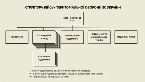 Las Fuerzas de Defensa Territorial se formaron después de la reorganización de los batallones de defensa territorial, son milicias voluntarias creadas durante la guerra del Dombás bajo el mando del Ministerio de Defensa Ministerio de Defensa de Ucrania.[1] Las unidades de Defensa Territorial existieron desde 2015 hasta 2021 en formas semiorganizadas hasta 2022, cuando se organizaron oficialmente en un cuerpo unificado que formó una rama separada de las Fuerzas Armadas de Ucrania.[2][3]