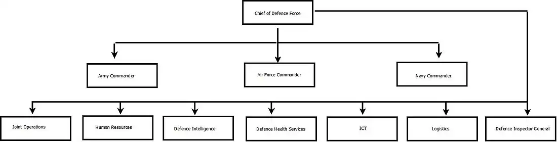 El Jefe de las Fuerzas de Defensa es el oficial de más alto rango y ejerce el mando ejecutivo general de las fuerzas. Los jefes de servicio son oficiales generales de dos estrellas, oficiales del aire y oficiales de bandera al mando de sus respectivas ramas de servicio. Las direcciones de las Fuerzas de Defensa Nacional están dirigidas por oficiales generales de una estrella, oficiales del aire y oficiales de bandera. La excepción, sin embargo, es la Dirección de Operaciones Conjuntas, cuyo jefe es un general de división. La Dirección de Operaciones Conjuntas es responsable del despliegue de fuerzas en las Fuerzas Armadas.